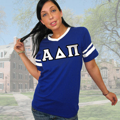 Alpha Delta Pi V-Neck Jersey with Striped Sleeves