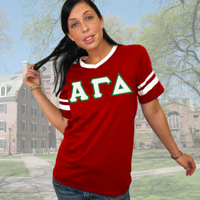 Alpha Gamma Delta V-Neck Jersey with Striped Sleeves