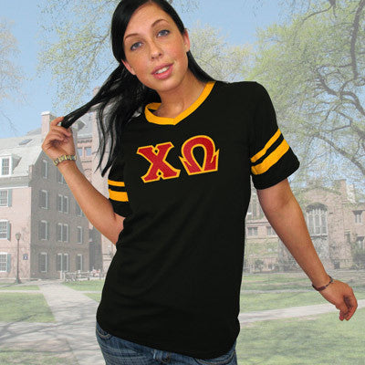 Chi Omega V-Neck Jersey with Striped Sleeves