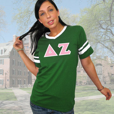Delta Zeta V-Neck Jersey with Striped Sleeves