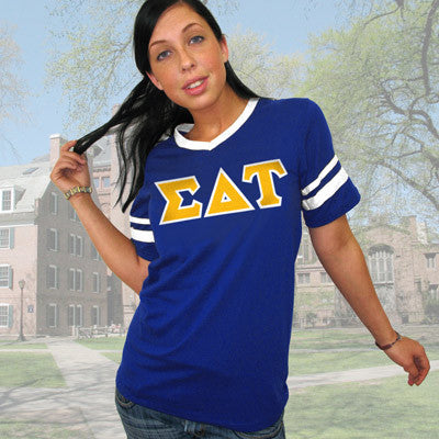 Sigma Delta Tau V-Neck Jersey with Striped Sleeves