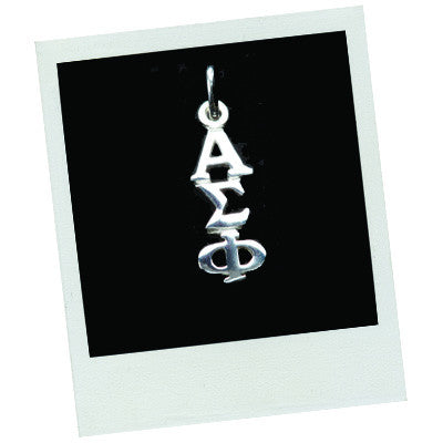 Lavalier with Alpha Sigma Phi letters hanging vertically. Chains must be ordered separately. Due to unforeseen supply issues, this item is only available in sterling silver at this time. Rush service is available for a fee of 20% of total.
