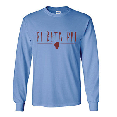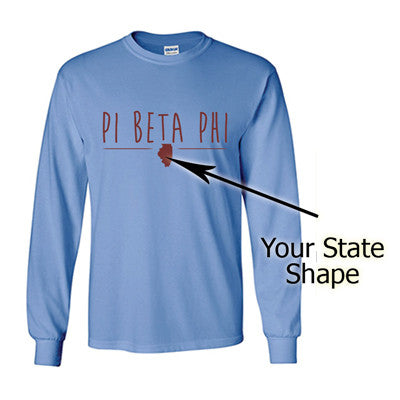 Show off your state and your Fraternity/Sorority at the same time! This longsleeve tee comes with your organization's name written out in the middle as shown here, as well as the shape of the state you selected. You can choose the state you would like to be displayed; it can be your current location or your founding state.
