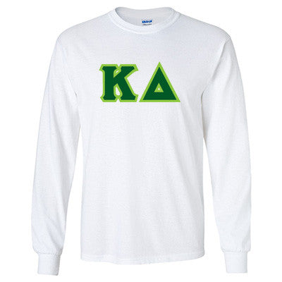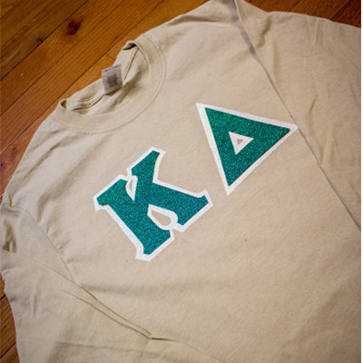 This Kappa Delta sorority longsleeve comes with 4-inch twill sewn-on letters for Kappa Delta across the front of the shirt. You can choose the color of the longsleeve, size and the letter and border combinations.