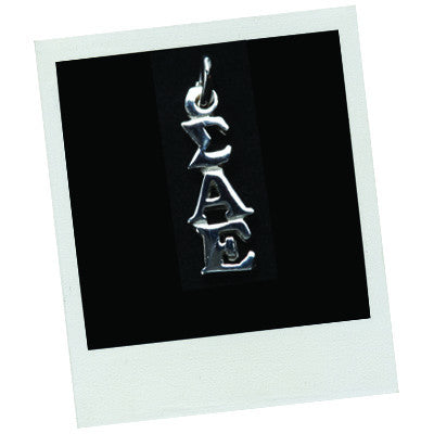 Lavalier with Sigma Alpha Epsilon letters hanging vertically. Chains must be ordered separately. Due to unforeseen supply issues, this item is only available in sterling silver at this time. Rush service is available for a fee of 20% of total.