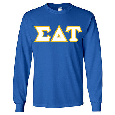 This Sigma Delta Tau sorority longsleeve comes with 4-inch twill sewn-on letters for Sigma Delta Tau across the front of the shirt. You can choose the color of the longsleeve, size and the letter and border combinations.
