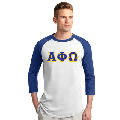 Fraternity 3/4-Sleeve Raglan Colorblock Jersey Tee comes with 3-Inch twill Alpha Phi Omega sewn-on letters placed across the center chest of the shirt.