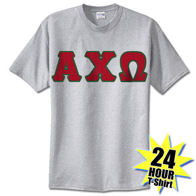 Features: This 24-Hour Tee can be selected in either Sport Grey (pictured) or in Black, please make that selection below as well as the size needed. T-Shirt will come with sewn-on twill Greek letters for Alpha Chi Omega. We have selected your letter color / border color (pictured) for you to make it easier and to Rush the product out to you.