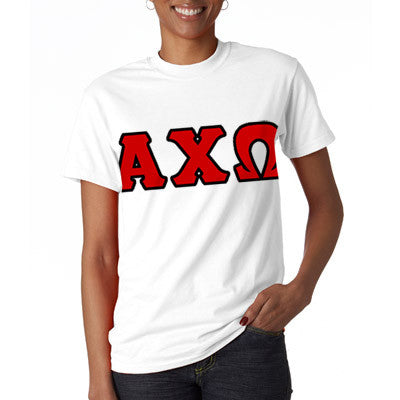 100% cotton 5.3oz preshrunk Gildan Unisex/Men's Sized T-Shirt comes with Alpha Chi Omega in Greek Twill letters sewn on the front. Double-needle stitching throughout; seamless topstitched collar; taped neck and shoulders. Rush service is available for a fee of 20% of total.