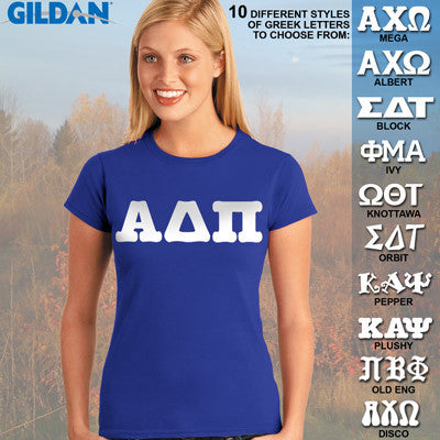 This Gildan ladies' tee is made up of the brand new Soft Style material and comes with the Alpha Delta Pi Greek symbols printed across the front in 3-inches in the font of your choice. This is a printed item and does NOT have twill letters.