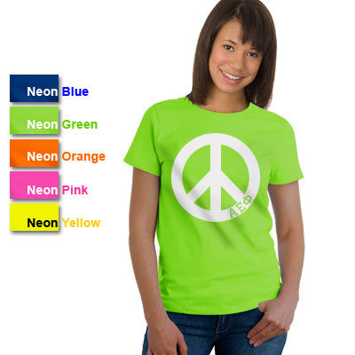 Alpha Epsilon Phi unisex/men's sized neon peace sign printed tee comes as shown. This shirt glows under blacklight! This is a unisex/men's sized shirt and is NOT a ladies or fitted t-shirt. Shirt Features: Preshrunk 100% cotton jersey; 5.3-ounce; shoulder-to-shoulder tape; double-needle neck, sleeve and bottom hem. Rush service is available for 15% of the total price, this option is available during checkout. This is a PRINTED item. This item does NOT have sewn on twill letters. Any questions, please contact customer service.