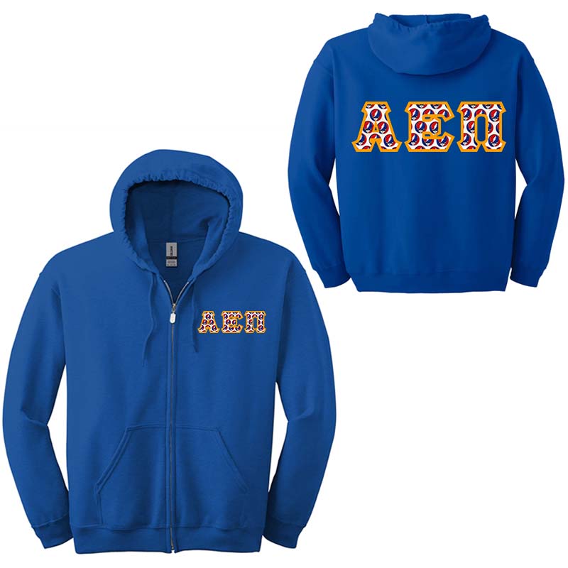 Customize our best-selling Greek Full-Zip Unisex Hoodie with your Alpha Epsilon Pi letters! Choose from over 450+ different Greek letter twill designs, colors and patterns. You can choose to have custom 2" Greek Letters across the left chest, 4" Greek Letters across the upper back, or both placements!