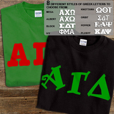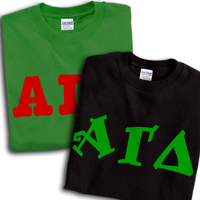 Get 2 Alpha Gamma Delta printed t-shirts for almost the same price as getting one! 8 fonts and multiple colors to choose from. Gildan 5.3oz. 100% cotton, preshrunk t-shirts. Double-needle stitching throughout, seamless topstitched collar, taped neck and shoulders. Ash color is 99% cotton, 1% polyester, Sports Grey color is 90% cotton, 10% polyester, Heather Cardinal, Dark Heather and Heather Indigo are 50% cotton and 50% polyester. Rush service is available for 15% of the total price, this option is available during checkout. This is a PRINTED item. This item does NOT have sewn on twill letters. Any questions, please contact customer service.