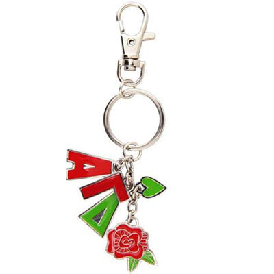 Alpha Gamma Delta Charm Keychain comes in your Sororities' colors and has your organizations' letters and mascot dangling. 4 Separate enamel charms; length is approximately 3.5 inches. Rush service is available for 15% of the total price, this service can be selected during checkout.