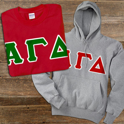 Alpha Gamma Delta hoody / t-shirt pack comes with 4 inch twill Greek letters sewn on the front of both garments.Hoody: Gildan 7.75oz unisex/men's sized hooded sweatshirt, 50% cotton and 50% polyester. T-Shirt: Gildan 5.3oz unisex/men's sized t-shirt, 100% cotton, preshrunk. Rush service is available for a fee of 15% of the total price, this service can be selected during checkout.