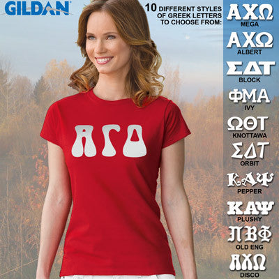 This Gildan ladies' tee is made up of the brand new Soft Style material and comes with the Alpha Gamma Delta Greek symbols printed across the front in 3-inches in the font of your choice. This is a printed item and does NOT have twill letters.