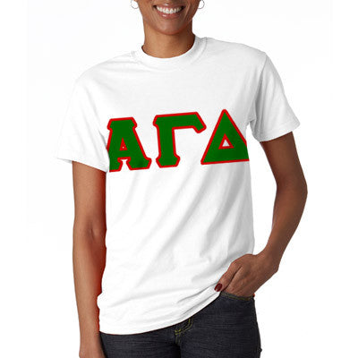 100% cotton 5.3oz preshrunk Gildan Unisex/Men's Sized T-Shirt comes with Alpha Gamma Delta in Greek Twill letters sewn on the front. Double-needle stitching throughout; seamless topstitched collar; taped neck and shoulders. Rush service is available for a fee of 20% of total.