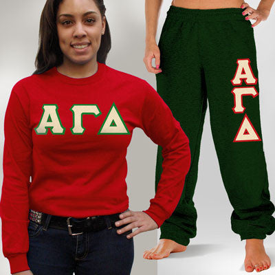 This package comes with the Gildan unisex/men's sized longsleeve with 4 inch twill letters going across the chest and Jerzees unisex/men's sized sweatpants with 4 inch twill letters going down the left leg. Due to licensing restrictions from your Nationals-we cannot place letters on the butt. Both items will come with the Alpha Gamma Delta greek symbols.