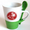 This Alpha Gamma Delta Sorority coffee mug features a spoon to mix your coffee or soup built into the handle. Ceramic coffee mug comes as shown in the picture. This mug must be hand washed and not for use in the microwave. Rush service is available for 15% of the total, this service can be selected during checkout.