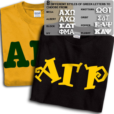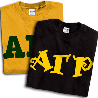 Get 2 Alpha Gamma Rho printed t-shirts for almost the same price as getting one! 8 fonts and multiple colors to choose from. Gildan 5.3oz. 100% cotton, preshrunk t-shirts. Double-needle stitching throughout, seamless topstitched collar, taped neck and shoulders. Ash color is 99% cotton, 1% polyester, Sports Grey color is 90% cotton, 10% polyester, Heather Cardinal, Dark Heather and Heather Indigo are 50% cotton and 50% polyester. Rush service is available for 15% of the total price, this option is available during checkout. This is a PRINTED item. This item does NOT have sewn on twill letters. Any questions, please contact customer service.