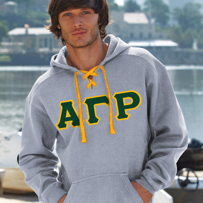 This sport laced hockey hooded sweatshirt comes with the Alpha Gamma Rho Greek symbols in 4-inch twill sewn-on letters across the chest. Comes with white laces and an extra set in the color of your choice! This is a Unisex/Men's sized garment - if you have any questions please click on sizing chart below.