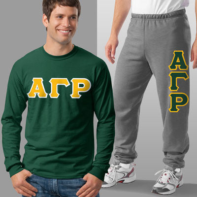 This package comes with the Gildan longsleeve with 4 inch twill letters going across the chest and Jerzees sweatpants with 4 inch twill letters going down the left leg. Both items will come with the Alpha Gamma Rho greek symbols.