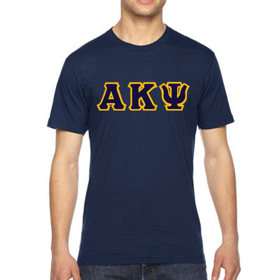 Customize this Fraternity Jersey Tee for Alpha Kappa Psi with your choice from over 400+ custom twill Greek letter patterns. The jersey knit material makes this one of our softest fraternity shirts, which is perfect for daily wear. The Greek letters are sewn-on and measure 4-inch height.