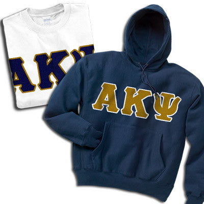 Alpha Kappa Psi hoody / t-shirt pack comes with 4 inch twill Greek letters sewn on the front of both garments. Hoody: Gildan 7.75oz unisex/men's sized hooded sweatshirt, 50% cotton and 50% polyester. T-Shirt: Gildan 5.3oz unisex/men's sized t-shirt, 100% cotton, preshrunk. Rush service is available for a fee of 15% of the total price, this service can be selected during checkout.