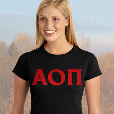This Gildan ladies' tee is made up of the brand new Soft Style material and comes with the Alpha Omicron Pi Greek symbols printed across the front in 3-inches in the font of your choice. This is a printed item and does NOT have twill letters.