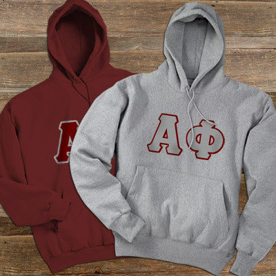 Alpha Phi hoodies come with 4 inch twill Greek letters sewn on the front. Gildan 7.75oz unisex/men's sized hooded sweatshirts, 2 for this low price! 50% cotton and 50% polyester. Rush service is available for a fee of 15% of the total price, this service can be selected during checkout.