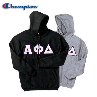 Get 2 of our best selling Champion Sweatshirts for a special discounted price. Sweatshirts can both be customized and will come with Alpha Phi Delta Greek letters sewn on the front in 4-inch twill. Champion Unisex/Men's Sized 9-ounce hooded fleece sweatshirt. 50% cotton, 50% polyester; Lycra enhanced trim; two-ply hood; front pouch with bartacks for durability; ribbed waistband; Clogo at left cuff. Rush service is available for 15% of the total price, this service can be selected during checkout.