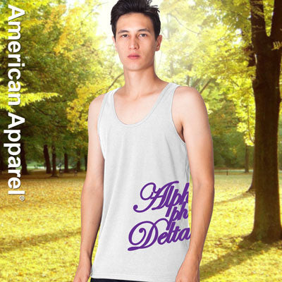 This American Apparel Unisex/Men's Sized printed tank top features a nice loose drape perfect for the summer heat. This tank comes with Alpha Phi Delta written out in the location and scripted font shown in the picture. This is a Printed garment - tank does NOT have twill sewn-on letters. Color: Brown only comes in sizes XS-L.