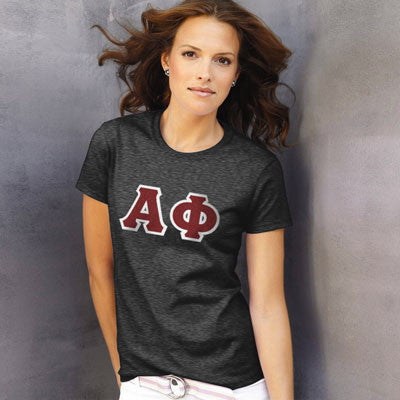 This t-shirt is an actual Gildan Ladies T-Shirt, made for Alpha Phi ladies. Shirt comes with 4-inch twill Alpha Phi Greek letters sewn on the front. Fits differently than any other shirt on our website, please view link below for sizing suggestions. Gildan Ladies 6.1oz preshrunk 100% cotton; new feminine cut; shorter length; narrower 1/2 inch rib neck; shorter sleeves. Rush service is available for 15% of the total price, this service can be selected during checkout.