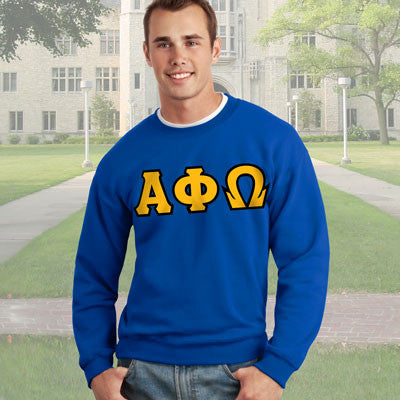 This Gildan crewneck comes with 4-inch twill sewn-on Alpha Phi Omega Greek symbols on the front.
