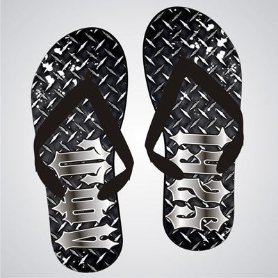 Brand New Product Exclusive To Something Greek, these Diamond Plate Printed Flip-Flops come with the Alpha Phi Omega greek symbols on the left flip flop as shown and the right flip flop will display the date you input. Comes in sizes Small - XL, and they are made of rubber.