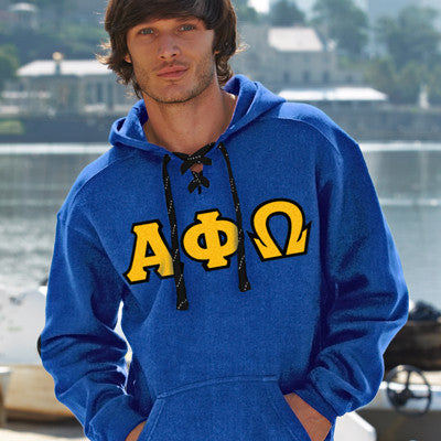 This sport laced hockey hooded sweatshirt comes with the Alpha Phi Omega Greek symbols in 4-inch twill sewn-on letters across the chest. Comes with white laces and an extra set in the color of your choice! This is a Unisex/Men's sized garment - if you have any questions please click on sizing chart below.