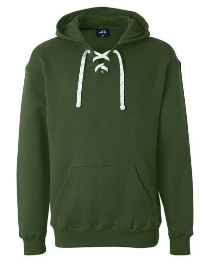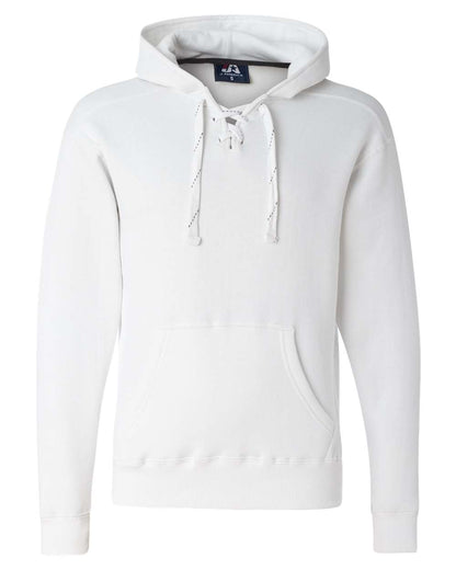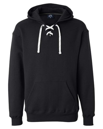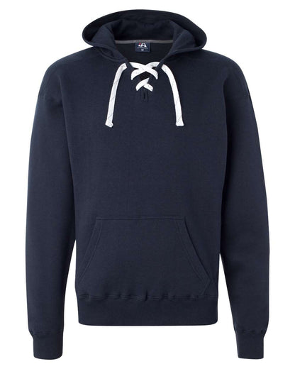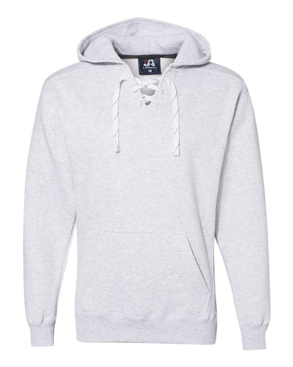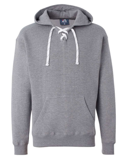 Hockey Hoody Features: J. America brand hoody; 10-ounce; 80% ring-spun cotton and 20% polyester; split front placket with 6 sewn eyelets; flat drawcord with grey ticking; jersey lined 3-piece hood; spandex blend ribbed waist, cuffs and side gusset panels; sport shoulder panel; unisex/men's sizing.