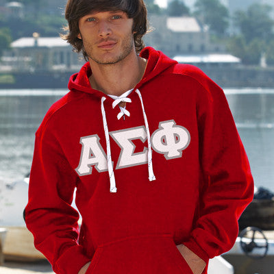 This sport laced hockey hooded sweatshirt comes with the Alpha Sigma Phi Greek symbols in 4-inch twill sewn-on letters across the chest. Comes with white laces and an extra set in the color of your choice! This is a Unisex/Men's sized garment - if you have any questions please click on sizing chart below.