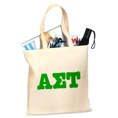 Alpha Sigma Tau printed tote bag perfect for your everyday needs at a low cost. The Greek letters for Alpha Sigma Tau will be used in the color of your choice. Budget Tote bag 6 oz. canvas self-fabric handles. 100% cotton, 15 inches x 16 inches. Available in Natural color only. Rush service is available for 20% of the total price, this option is available during checkout. This is a PRINTED item. This item does NOT have sewn on twill letters. Any questions, please contact customer service.