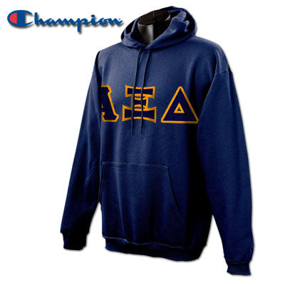 This Champion 9-ounce unisex/men's sized hooded sweatshirt is made specifically for Alpha Xi Delta and comes with your Greek letters in twill sewn on the front.