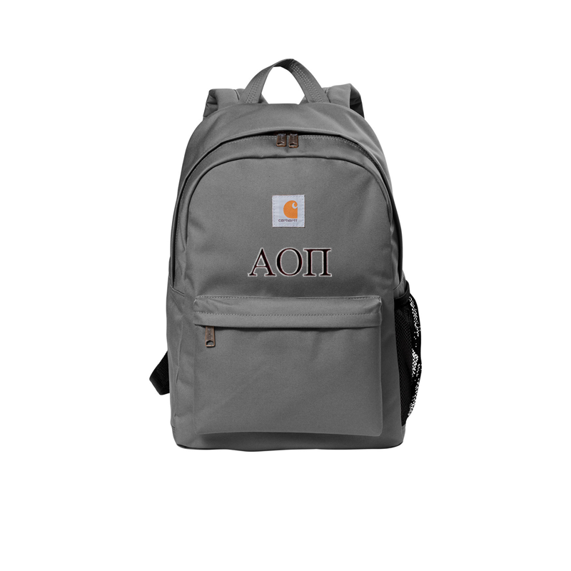 This Greek Carhartt® Canvas Backback comes with the embroidered design shown. You just pick a Bag Color, Inside Embroidery Color, Outside Embroidery Color, and then choose your Greek letters for your organization.