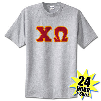 Features: This 24-Hour Tee can be selected in either Sport Grey (pictured) or in Black, please make that selection below as well as the size needed. T-Shirt will come with sewn-on twill Greek letters for Chi Omega. We have selected your letter color / border color (pictured) for you to make it easier and to Rush the product out to you.
