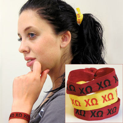 Chi Omega Sorority hair ties can be used to hold up a ponytail or as a bracelet. All three are included for one low price. Hair ties come as shown in the photo and are made specifically for Chi Omega. Made with an elastic stretchy material that will not slip, rip or break your hair. Rush service is available for 15% of the total, this service can be selected during checkout.
