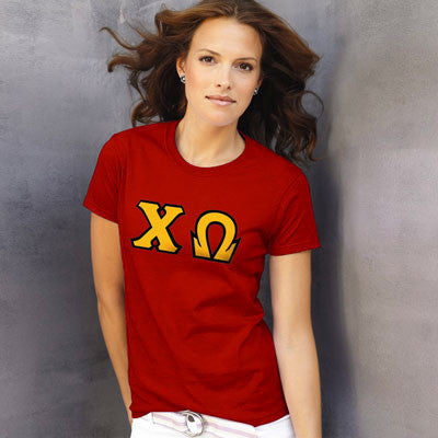This t-shirt is an actual Gildan Ladies T-Shirt, made for Chi Omega ladies. Shirt comes with 4-inch twill Chi Omega Greek letters sewn on the front. Fits differently than any other shirt on our website, please view link below for sizing suggestions. Gildan Ladies 6.1oz preshrunk 100% cotton; new feminine cut; shorter length; narrower 1/2 inch rib neck; shorter sleeves. Rush service is available for 15% of the total price, this service can be selected during checkout.