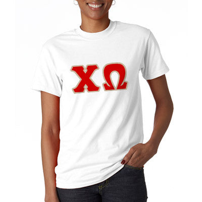 100% cotton 5.3oz preshrunk Gildan Unisex/Men's Sized T-Shirt comes with Chi Omega in Greek Twill letters sewn on the front. Double-needle stitching throughout; seamless topstitched collar; taped neck and shoulders. Rush service is available for a fee of 20% of total.