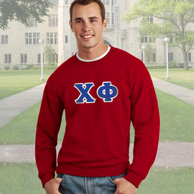 This Gildan crewneck comes with 4-inch twill sewn-on Chi Phi Greek symbols on the front.