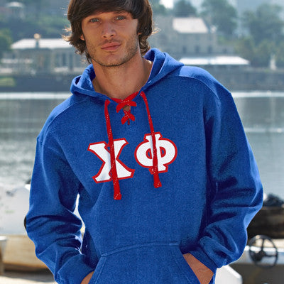 This sport laced hockey hooded sweatshirt comes with the Chi Phi Greek symbols in 4-inch twill sewn-on letters across the chest. Comes with white laces and an extra set in the color of your choice! This is a Unisex/Men's sized garment - if you have any questions please click on sizing chart below.