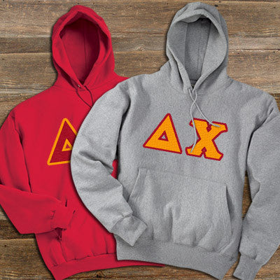 Delta Chi hoodies come with 4 inch twill Greek letters sewn on the front. Gildan 7.75oz unisex/men's sized hooded sweatshirts, 2 for this low price! 50% cotton and 50% polyester. Rush service is available for a fee of 15% of the total price, this service can be selected during checkout.