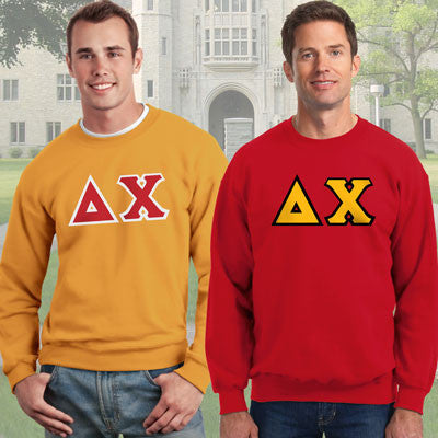 Buy 2 9-ounce crewneck Delta Chi Gildan sweatshirts and save money! Crewneck sweatshirts will come with 4-inch Delta Chi twill sewn-on letters. Sweatshirts are unisex/men's sized.