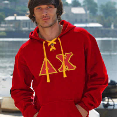 This sport laced hockey hooded sweatshirt comes with the Delta Chi Greek symbols in 4-inch twill sewn-on letters across the chest. Comes with white laces and an extra set in the color of your choice! This is a Unisex/Men's sized garment - if you have any questions please click on sizing chart below.